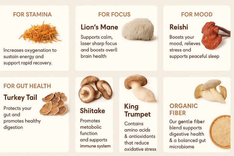 Each organic mushroom in our blend was carefully handpicked for its distinct health benefits, to address your physical and mental wellbeing